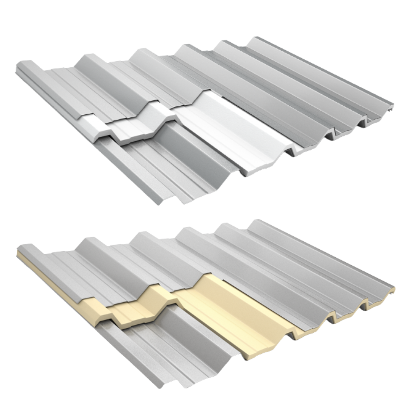 A telha Termoacústica sanduíche é composta por telha metálica na parte superior, EPS ou PIR no meio e outra peça de telha metálica na parte inferior. Esse modelo é ideal para obras onde a telha fica exposta na parte de baixo, pois garante um aspecto estético elegante ao mesmo tempo que projete o EPS ou o PIR. A telha pode ser fabricada no formato trapézio 25, trapézio 40 ou ondulado 17